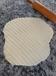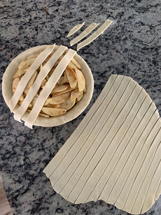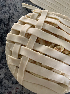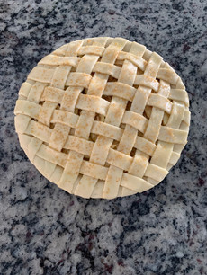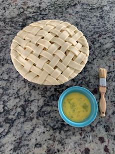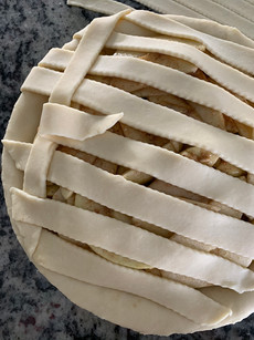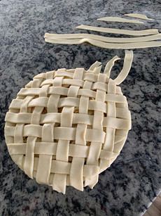 Roll out remaining dough and cut into one inch wide strips. Layer about seven strips across pie leaving a slight gap between each strip. Weave in remaining strips across pie creating a lattice pattern.