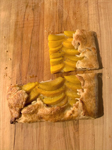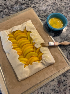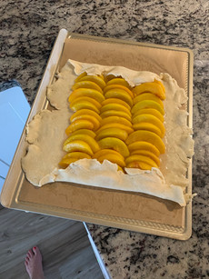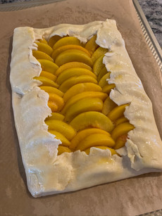 Place sliced peach in a decorative and organized manner in the center of tart dough and leave an inch to an inch and a half of excess dough. Fold bottom and top of dough up over peaches, and then each side to create a rectangle.